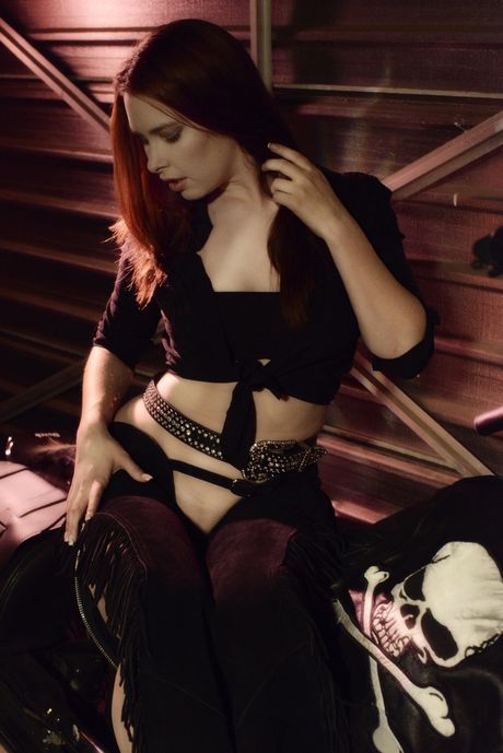 Melody Jordan strips off her leather jacket and boots and starts masturbating