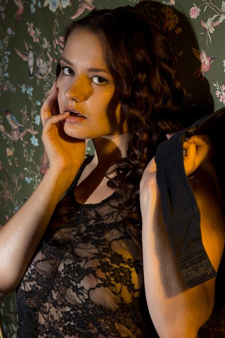 Nice teen Katherina removes red lingerie and stockings before masturbating