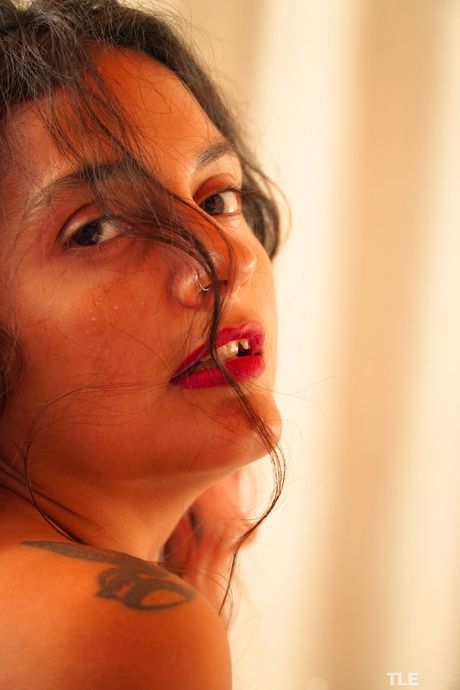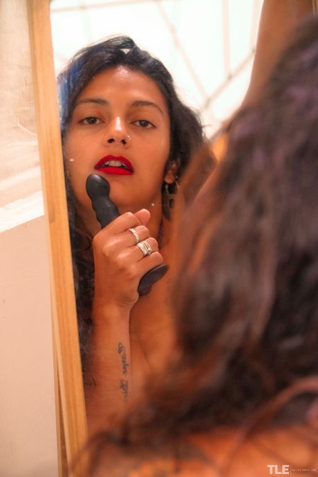 Noelia B is bound in red ropes as she pleasures her pussy with a glass dildo
