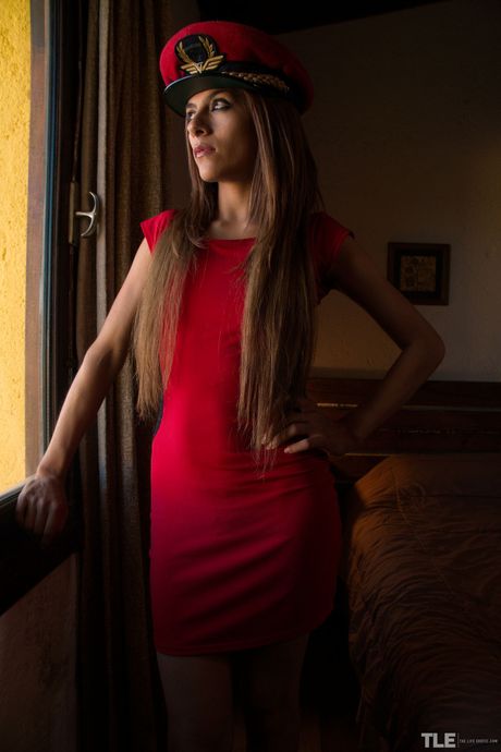 Paloma D is bound in a red uniform and heels, with her hair in a hat