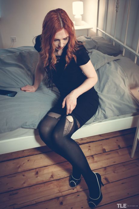 Perfect teen Lea B rips her pantyhose & fingers her pussy in the bedroom