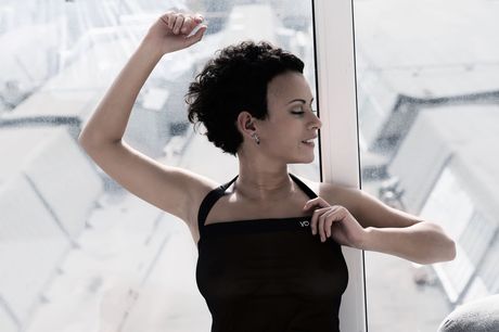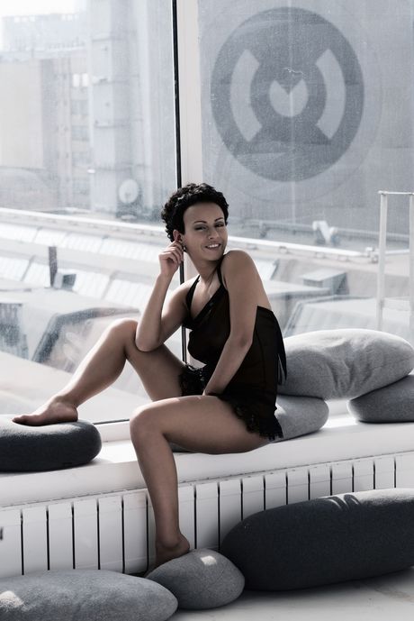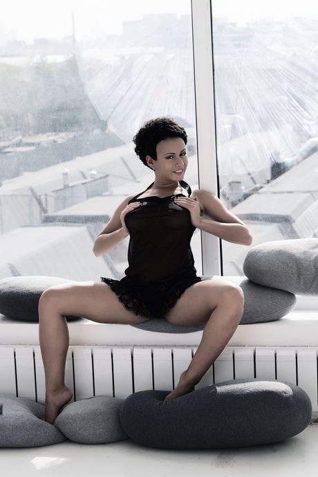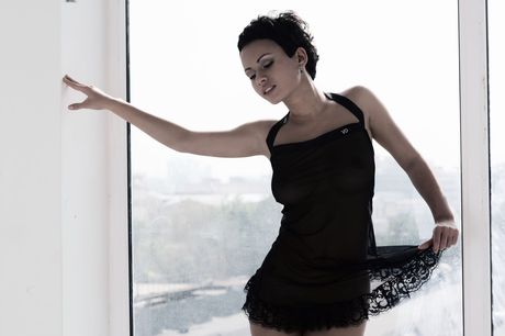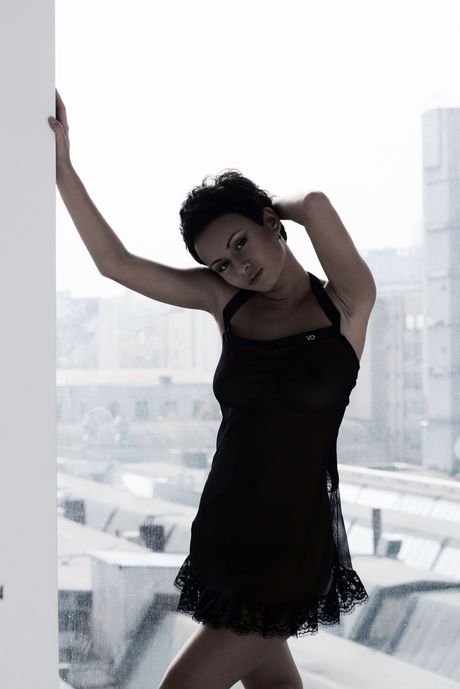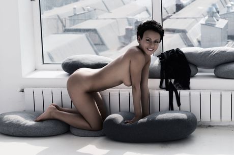Russian girl Pammie Lee removes a black dress to pose nude in heels