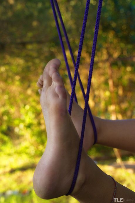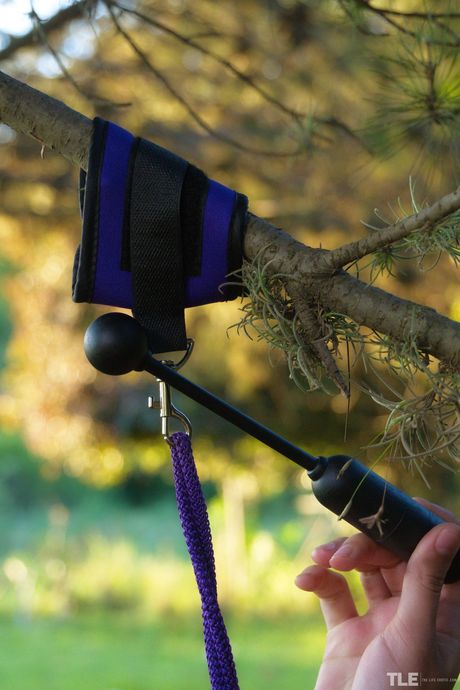 Selva is left alone in the garden, collared and bound hand and foot to a tree