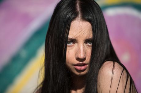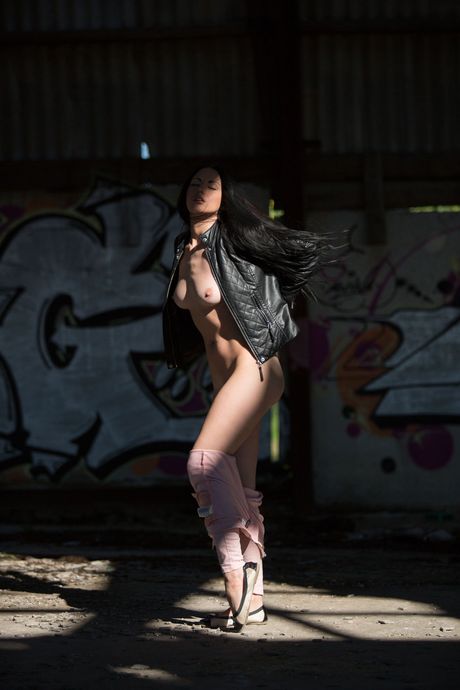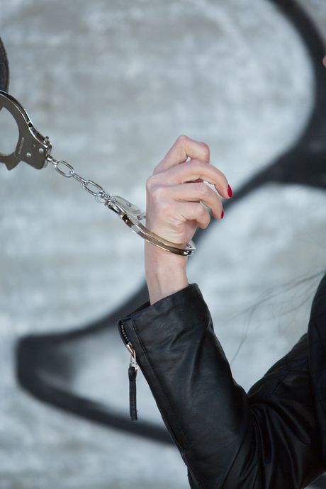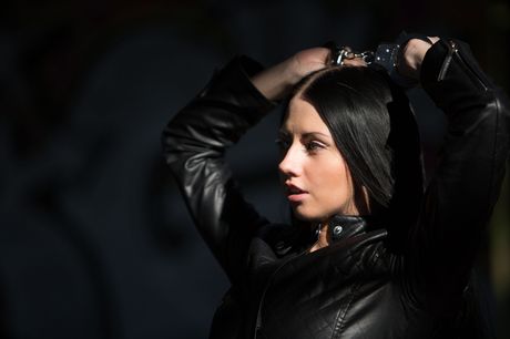 Sexy babe Veronica Snezna strips naked and poses in handcuffs outdoors