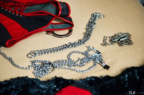 Sexy blonde Dido in black stockings & chains masturbates with a dildo
