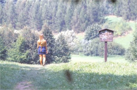 Sexy blonde Pavla in sheer lingerie spreading legs to show bald pussy outdoors