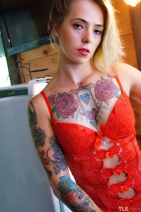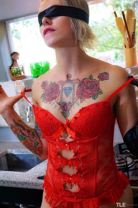 Sexy blonde Samira strips to her black lingerie and rubs her pussy with a squeegee