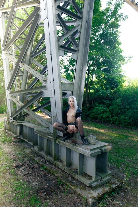 Sexy blonde teen Adelina White pees on the ground after a finger fuck
