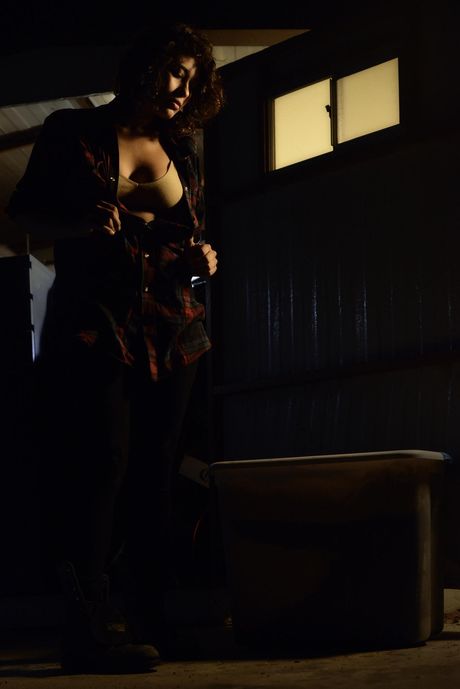Sexy brunette Raven Rockette strips to her socks and fingers her pussy