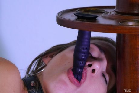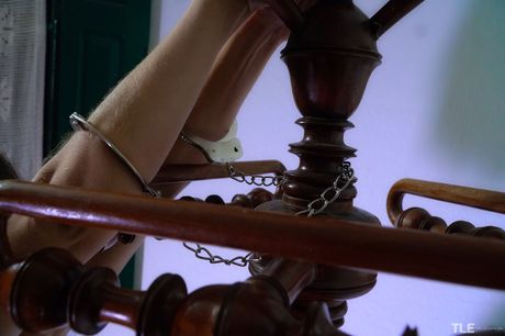 Sexy hazel eyed brunette Shannon is handcuffed naked to a coat stand