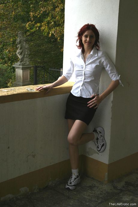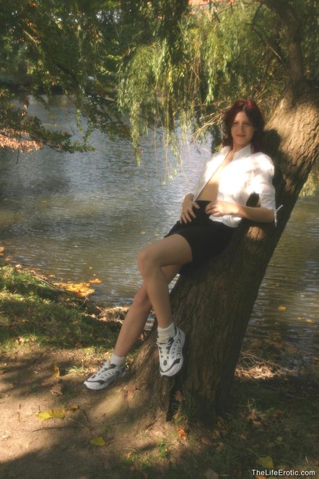 Sexy redhead Kathi takes off everything in socks & fingers her pussy in the countryside
