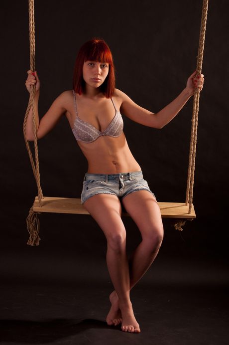 Sexy redhead Pettra strips her black lingerie & poses nude on a swing