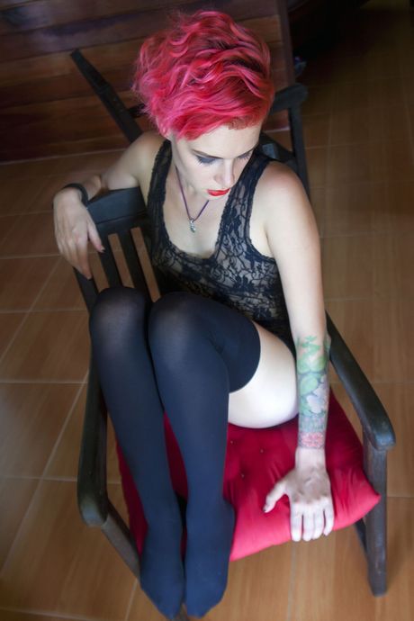 Short redhead Leocadia removes black lingerie to pose nude in OTK socks