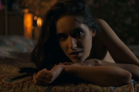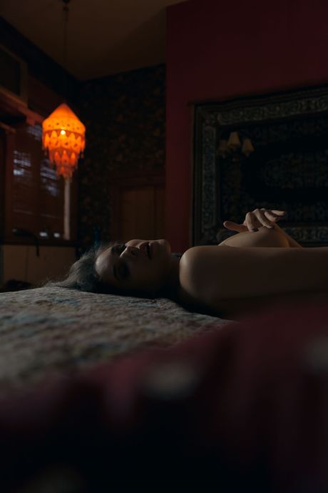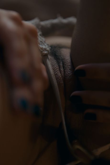 Slender teen Emily J uses a makeup brush to pleasure her trimmed pussy