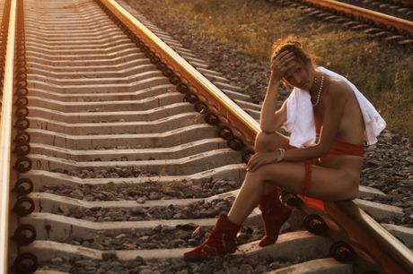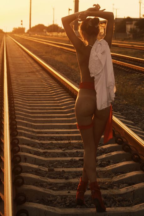 Slim brunette Lyala A gets naked on a railway track alluringly
