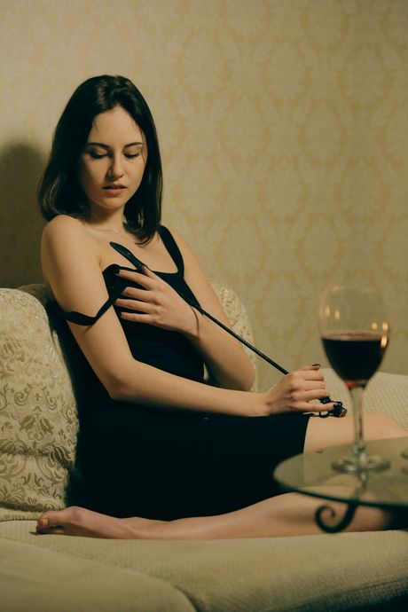 Svelte teen Sade Mare takes a riding crop to her naked body after being stood up