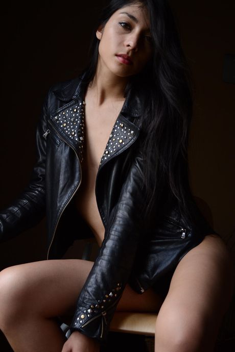 Tall teen girl with a shaved pussy and perky tits gets naked in a solo