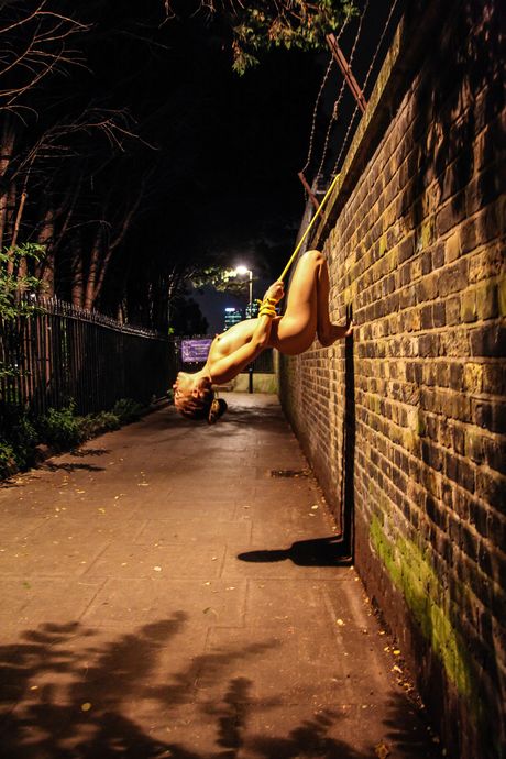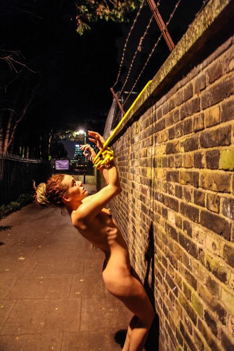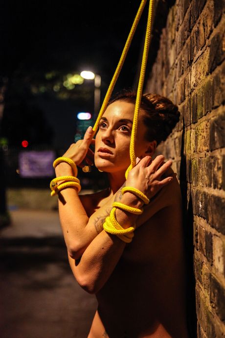 Tattooed teen Elle is bound to a wall with yellow rope during solo action