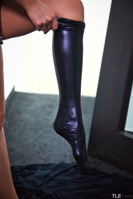 Teen model Josephine Jackson fingers her pussy in black OTK boots and hosiery