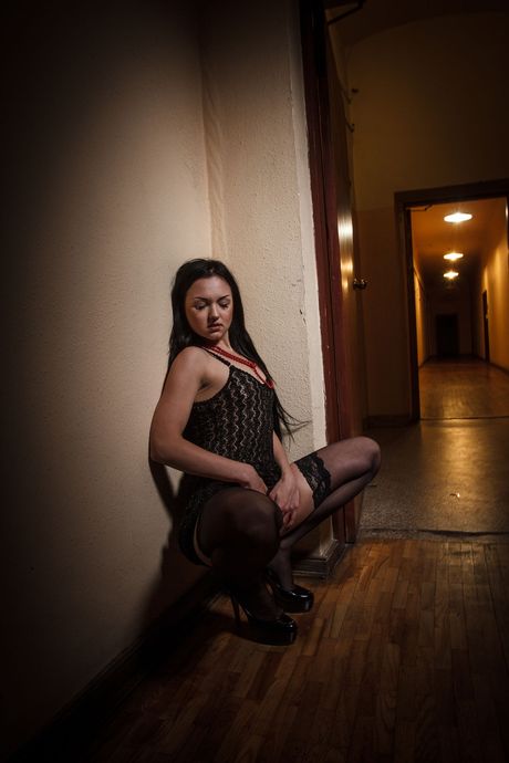 Teen model Lexi B removes a bra and thong set to get naked in stockings