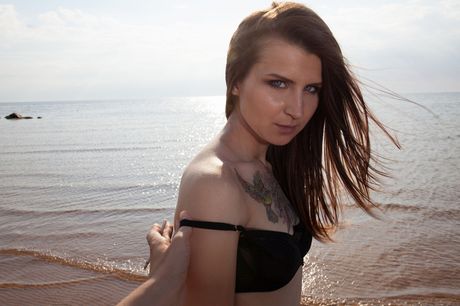 Winsome teen Ida gets naked on a beach before fingering her pussy