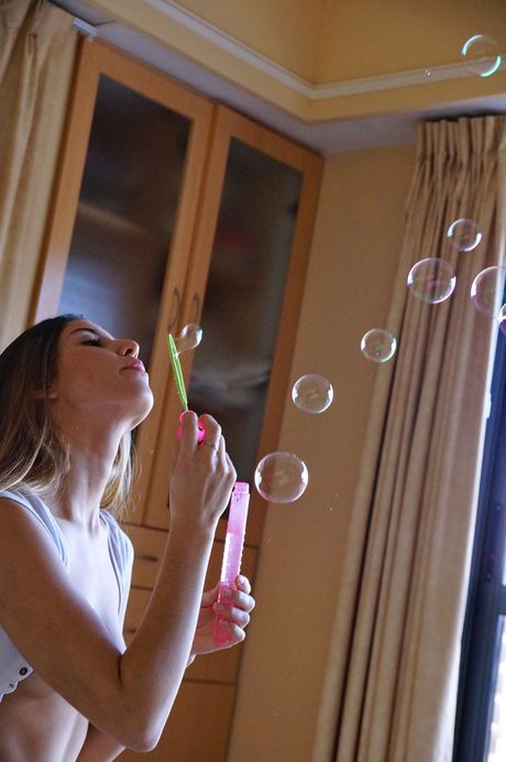 Young beauty Tatiana blows soap bubbles before dildoing her bald pussy