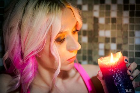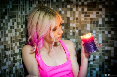 Young blonde Ingrid masturbates with a candle while wearing knee socks