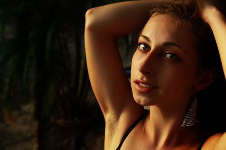 Young brunette Illaria removes a bra and panty set to get naked on a patio