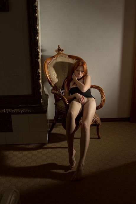 Young redhead Rebek doffs a black dress to pose nude in her bedroom