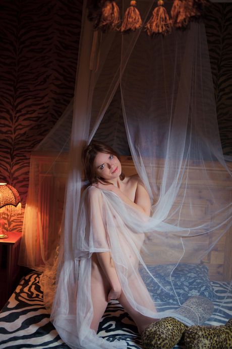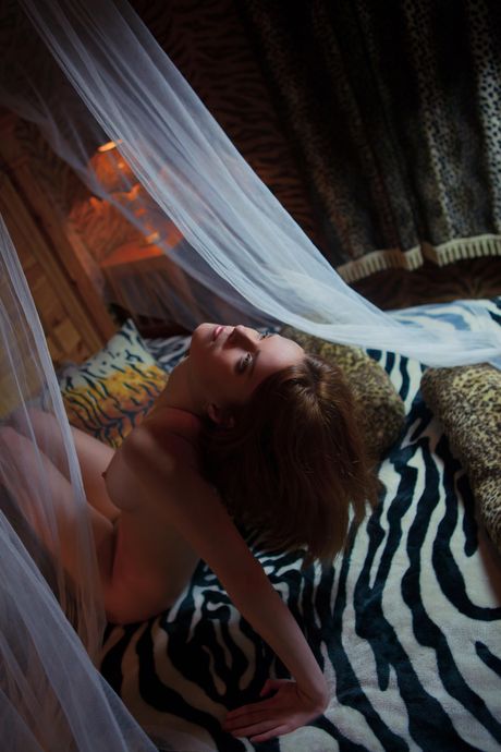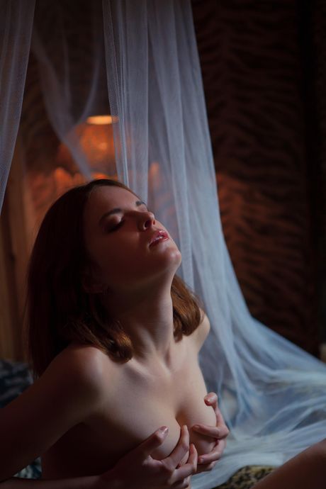 Young redhead Ualilou fondles her full breasts while naked atop her bed