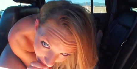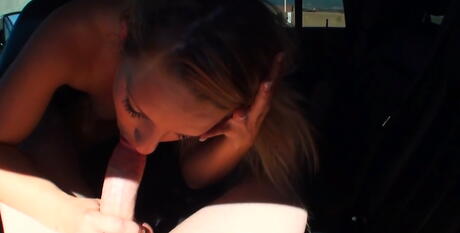 Very attractive american blonde Cali Carter work with wet lips on big rod and takes a cum shot in her mouth