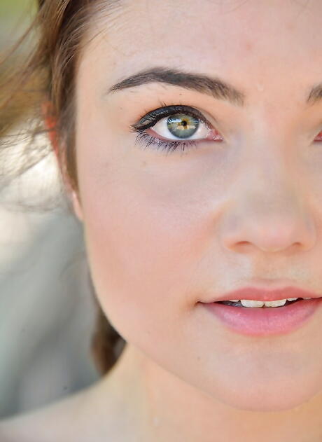 Very attractive american dark-haired young Adria Rae exposing small tits and playing with sex toy outside