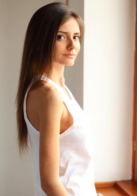Very attractive american dark-haired youthful Sunshine exposes big knockers and spreads her legs