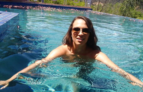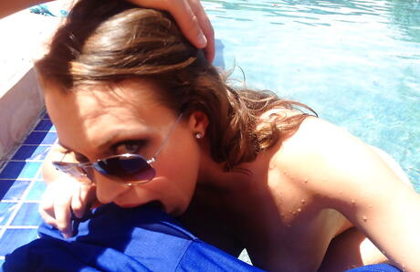 Very attractive american teen Lily Love in glasses take in mouth rod near the pool