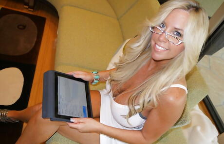 Very attractive american wife Sandra Otterson in sexy skirt showing big hooters and cute pussy