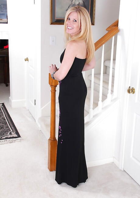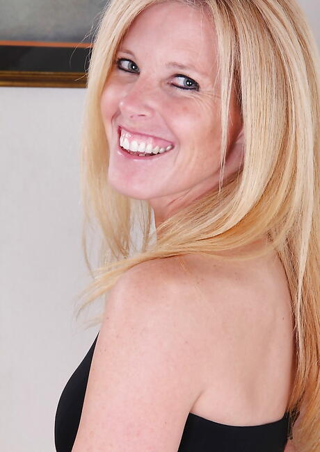 Very attractive blond older Monique 2 exposes big knockers and bald pussy