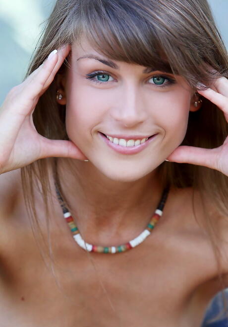 Very attractive brunette young Mia D unveils tiny tits and bald pussy outdoor