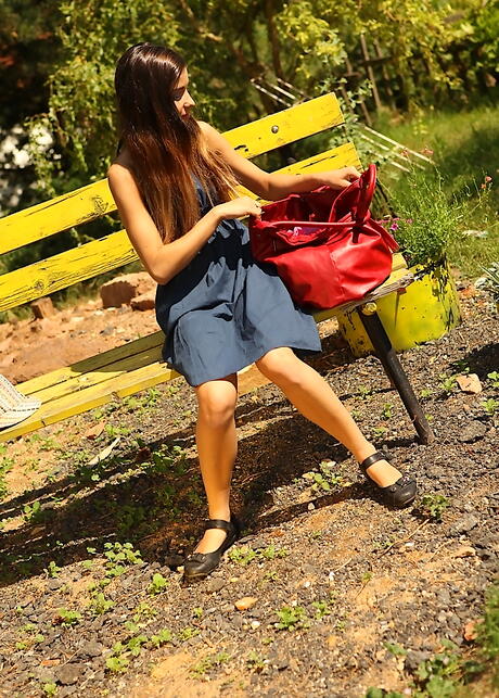 Very attractive brunette youthful Nika uncovers tiny tits and masturbates outdoor