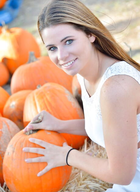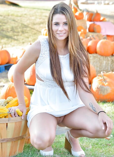 Very attractive dark hair young Aveline Kristie in nice skirt exposing big titties and spreading her legs outside
