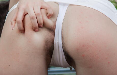 Very attractive dark-haired cutie Rimma S in lingerie uncovering tiny tits and spreading her legs