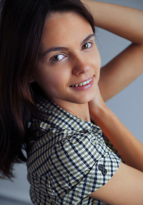 Very attractive dark-haired teen Lilit A baring small tits and bald pussy