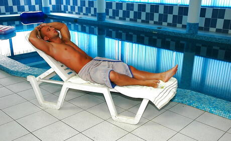 Very attractive mature Sarah Rayne bares big boobies and pussy near the pool