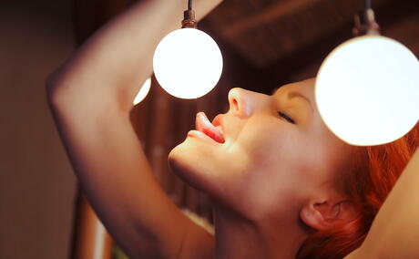 Very attractive red-haired young Walda exhibits big knockers and spreads her legs in kitchen