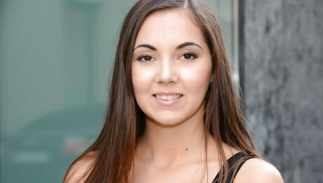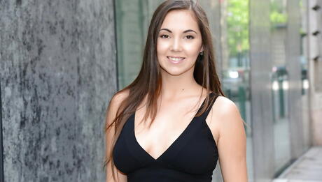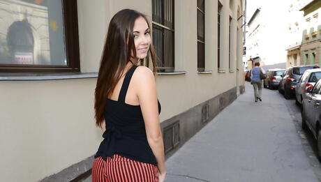 Very attractive russian babe Jay Dee in fancy shorts exposes her ass and shaved pussy outdoor
