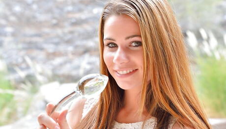 Very attractive teen Aveline Kristie exposing her butt and playing with dildo