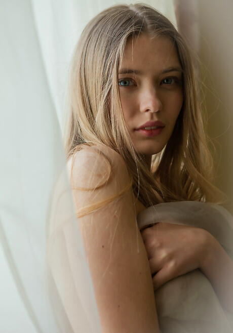 Very attractive teen Sigrid uncovers tiny tits and shaved pussy