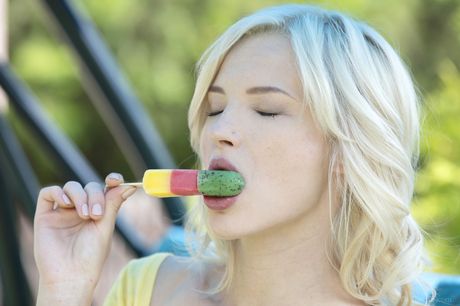 Blonde teen Zazie S removes a bikini before toying her pussy with a popsicle