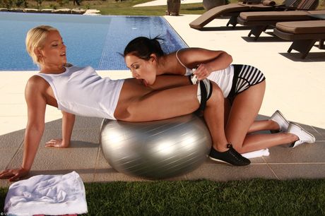 Hot lesbians Nicole Smith & Lana S lick pussies by the pool in socks