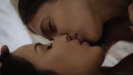 Lesbian girls Talia Mint & Anissa Kate kiss before licking pussies on a bed