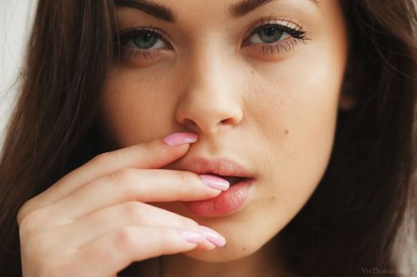 Lovely teen Amelie B removes black lingerie to model in the nude